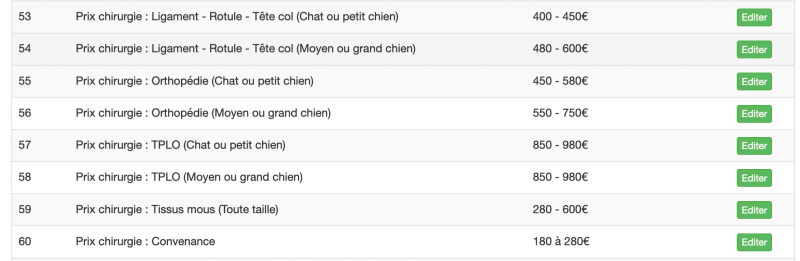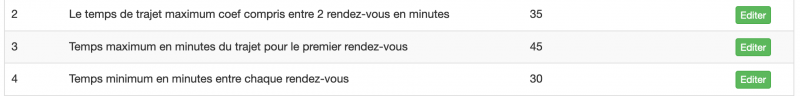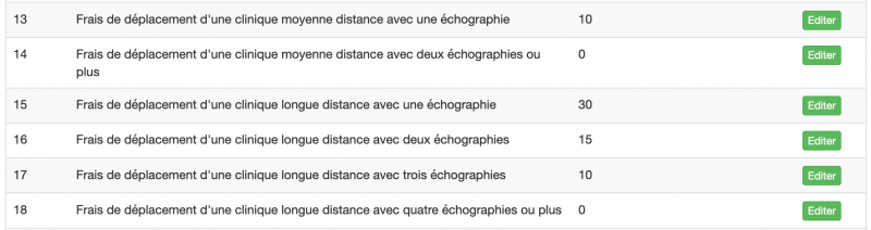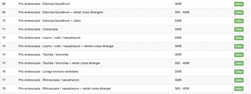 Les variables sont des valeurs que vous pouvez changer depuis le backoffice comme les temps de trajet entre deux rendez-vous, les frais de déplacement ou encore les tarifs de chirurgie et d'endoscopie. Ces paramètres sont accessibles depuis le menu de gauche : “Gestion des constantes” Pour modifier la valeur d'une constante il suffit de cliquer à droite sur le bouton vert éditer.
