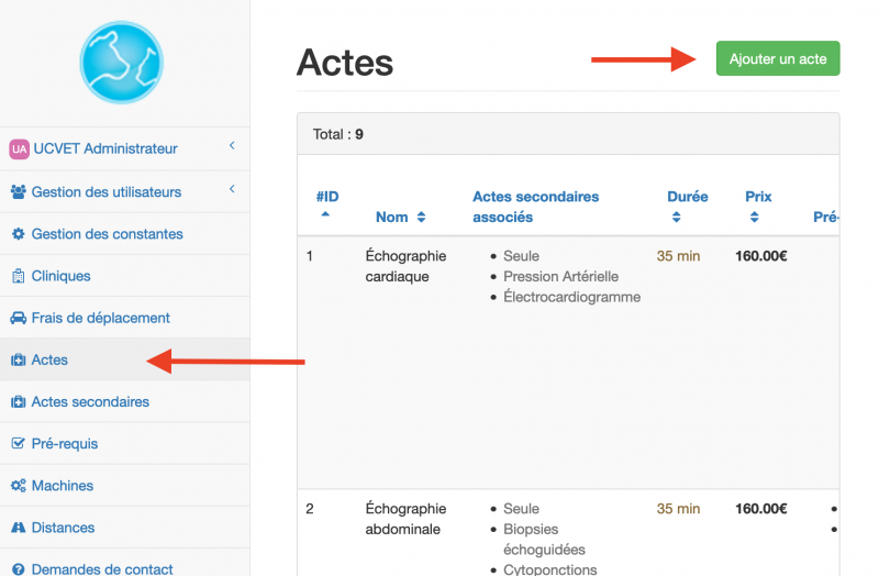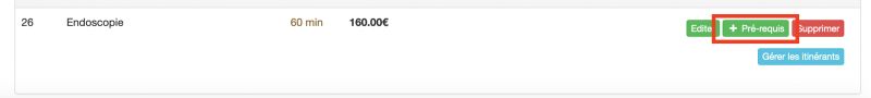 Certains actes nécessitent des pré-requis comme à jeun ou vessie pleine. Ce message s'affiche et doit être coché par la clinique pour valider la prise de rdv. Pour ajouter un pré-requis, retourner dans la liste des actes et après avoir repéré l'acte à modifier, cliquer sur le bouton + Pré-requis