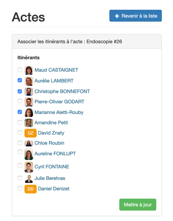 Cocher alors les itinérants aptes à réaliser l'acte concerné puis cliquer sur le bouton Mettre à jour