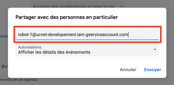 Dans le champ Ajouter un adresse mail, coller l'adresse mail suivante : robot-1@ucvet-developement.iam.gserviceaccount.com
